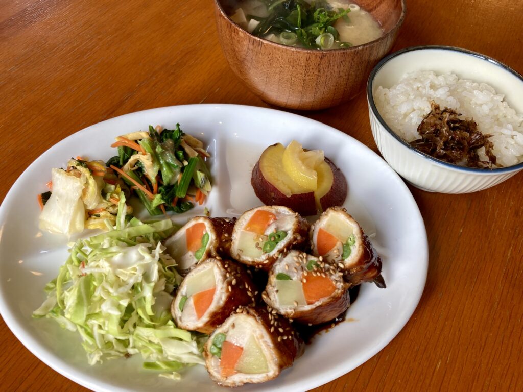 太めの野菜を豚ロース肉で巻いて甘辛く、ボリューミーに。